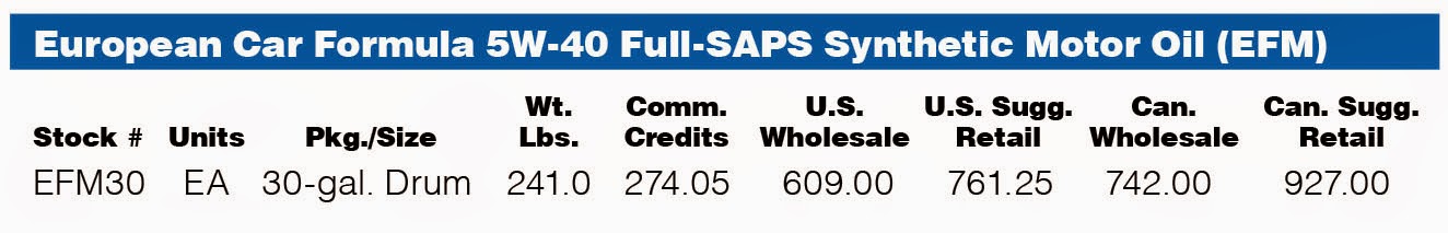 Effective May 1, European Car Formula 5W-40 Full-SAPS Synthetic Motor Oil (EFM) is available in 30-gallon drums.